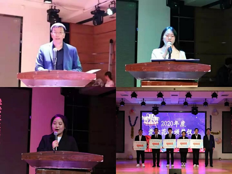 本次晚会在民族舞《大长今》的曼妙舞姿中拉开帷幕,首先由宗成文书记对2021届毕业生们送出最诚挚的祝福,接下来由爱心花语负责人刘爽为大家介绍爱心花语花艺工作室的历程,爱心花语秉承着“善举凝聚美”的理念连续几年在校内设立公益助学金。随后由吴荣哲主任为五名受助员工颁发共计5000元助学金,以此鼓励更多同学们积极创业,用所学知识回报社会,同时呼吁广老员工加入爱心花语团队,贡献青春力量。最后,由2018级园艺专业李竺洋作为员工代表发言,她表示今后将努力学习,用永不停歇的奋斗精神,回报祖国、回报社会。