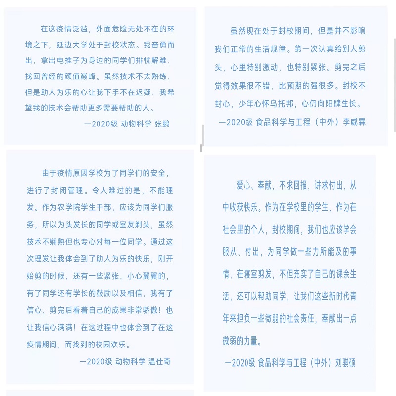 疫情防控是一场保卫人民群众生命安全和身体健康的严峻斗争,面对疫情每个人都怀揣着一颗赤忱的“为人民服务”的心,威廉希尔williamhill中文学子在疫情期间为同学们理发,倾力而为,助力抗疫,以实际行动展现青年风采。