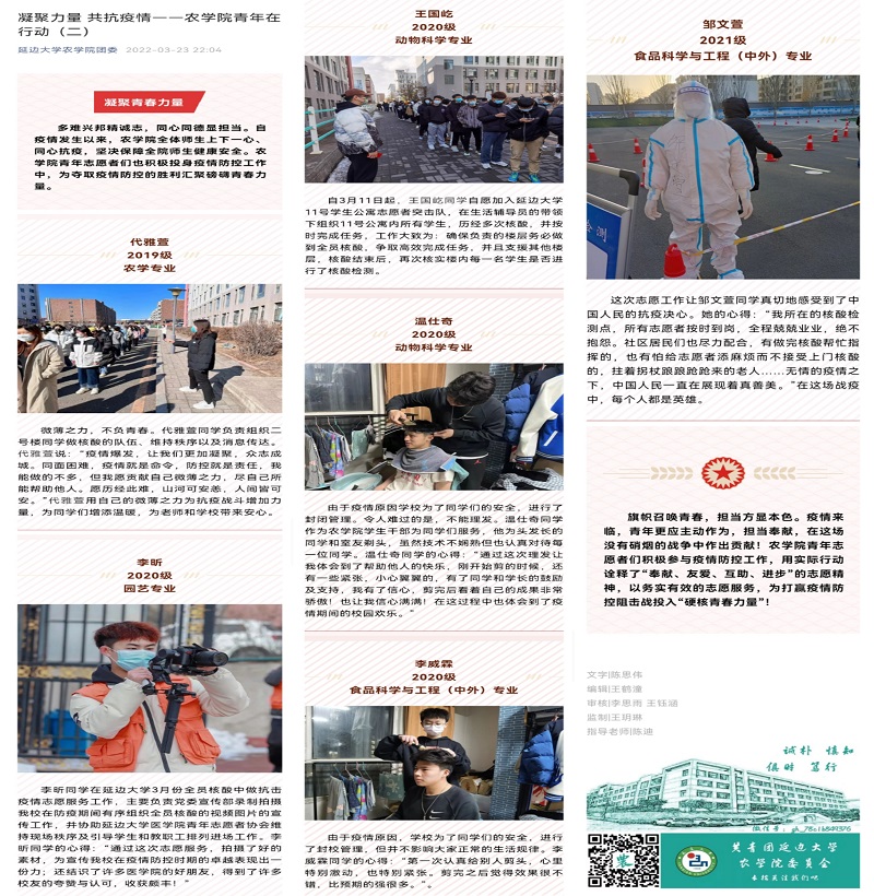 多难兴邦精诚志,同心同德显担当。自疫情发生以来,威廉希尔williamhill中文全体师生上下一心、同心抗疫,坚决保障全院师生健康安全。威廉希尔williamhill中文青年志愿者们也积极投身疫情防控工作中,为夺取疫情防控的胜利汇聚磅礴青春力量。