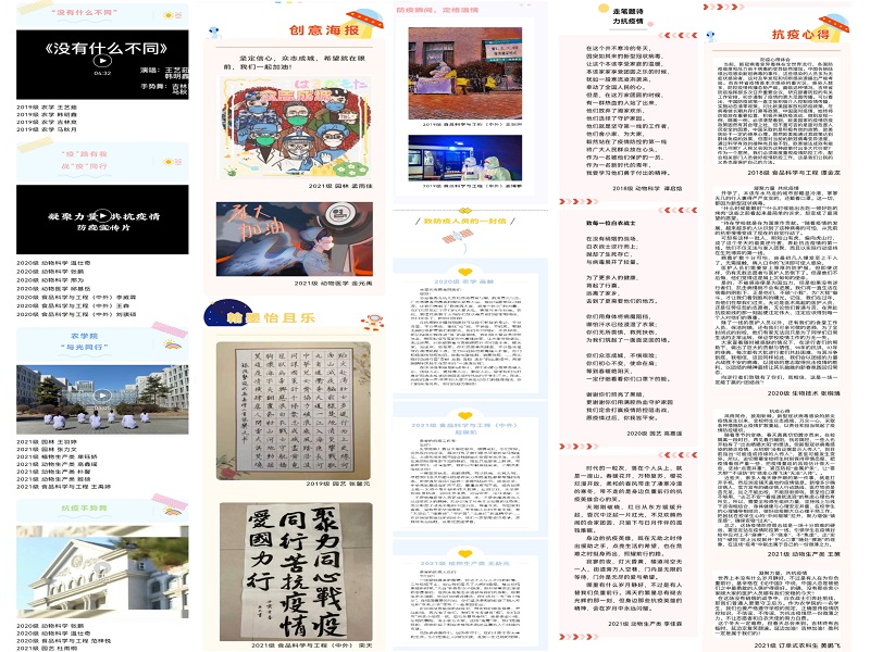 此次活动共征集4个视频作品、2张海报作品、2张书法作品、2张摄影作品、5封信件、4首诗歌作品以及14份感悟,广大团员以此来抒发对冲锋在防疫一线工作人员和志愿者们的感激之情,以手中的作品助力这场疫情防控阻击战!由于作品数量众多,本次平台选择各系各专业一些代表作品(排名不分先后)。