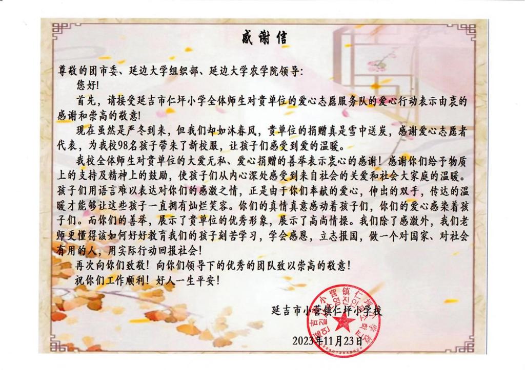 活动开始,仁坪小学少先队员代表为与会领导献戴红领巾。仪式上,与会领导向仁坪小学捐赠98套按员工身高体重量身定做的爱心校服,总价值1.4万余元。金庆国作为捐赠方代表致辞,勉励同学们感念于心、付诸于行,勤奋学习、努力工作、传承爱心善举,把中华美德传承、发扬光大。同时,希望双方以此为契机,未来开展更多形式、更深层次的交流活动。仁坪小学通过少先队员代表发言、朗诵表演,校方回赠感谢信来衷心感谢公司对仁坪小学教育的关心和支持。此次捐赠活动受到人民网、吉林日报等多家媒体的关注。